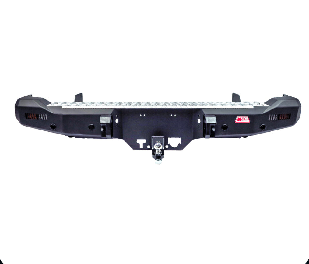 The MCC Rocker Rear Bar is both tough and functional. With a Sand Black Powder coated finish, dual number plate lamps, dual recovery points, and a nonslip checker plate step, this bar was built for the serious 4x4 enthusiast.